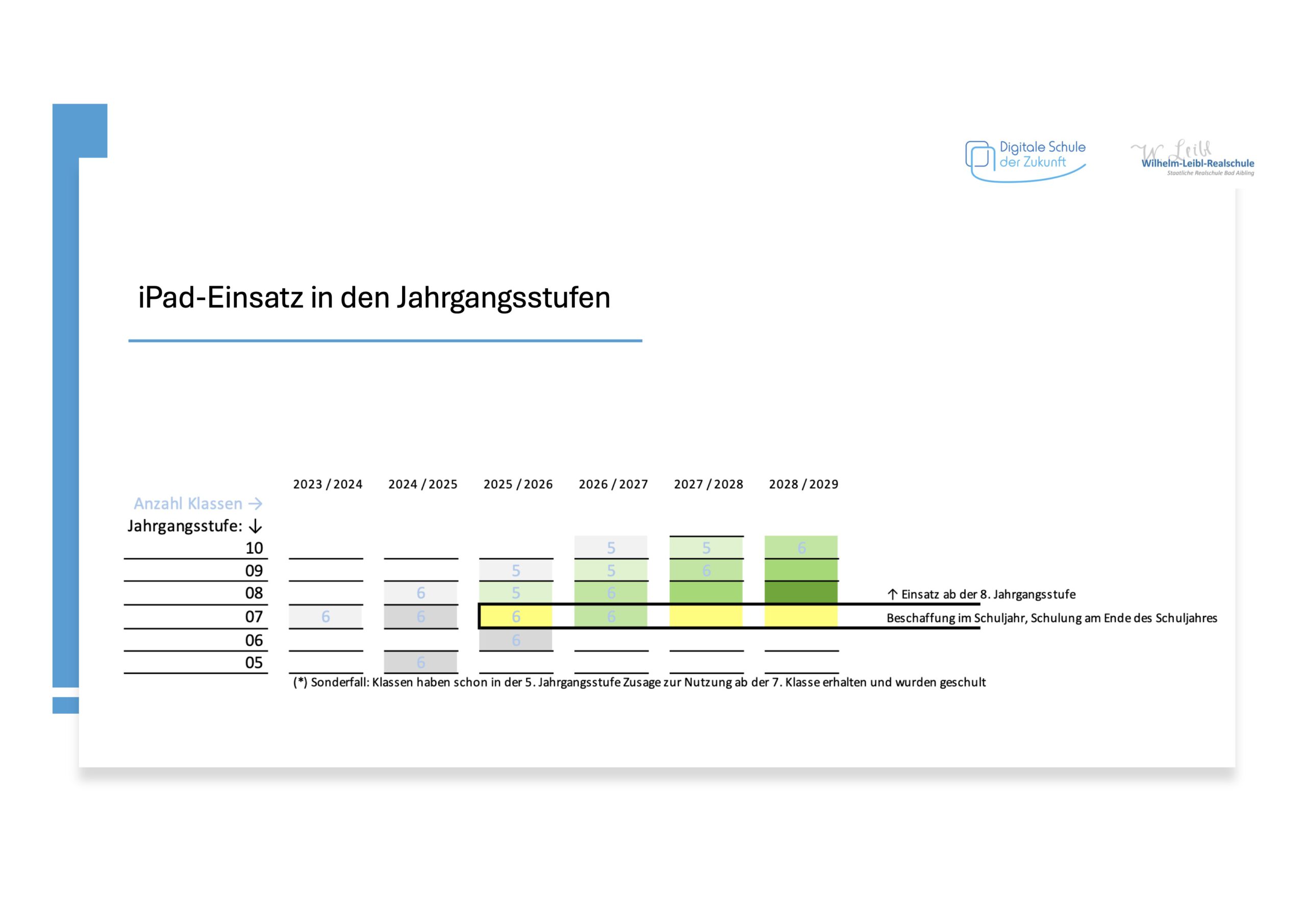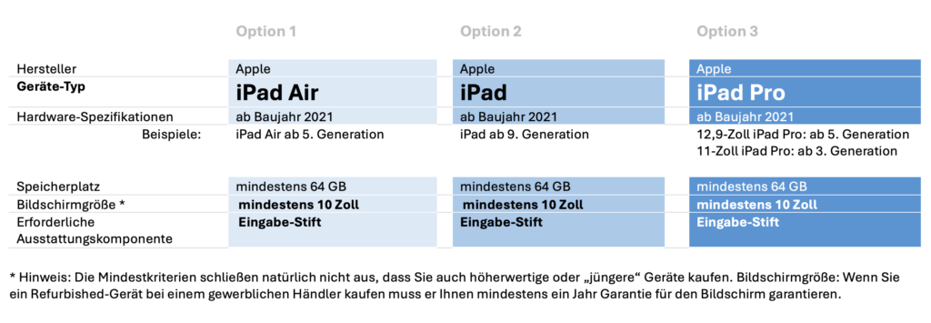 - Eigene iPads: Anschaffung im Laufe der 7. Jahrgangsstufe, Kaufzeitraum bis Juni.