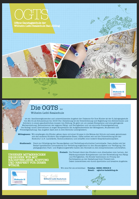 Nur diejenigen Schüler, deren Eltern dies wünschen, besuchen nach dem planmäßigen Unterricht die Ganztagsangebote. grundsätzlich mit einer Betreuungszeit bis 16 Uhr. Die „Offene Ganztagsschule (OGTS)“ ist ein nach der verbindlichen Anmeldung durch die Eltern verpflichtendes Programm in einem wöchentlich wiederkehrenden Tagesrhythmus. An der Wilhelm-Leibl-Realschule Bad Aibling wird dieses Angebot von unserem Kooperationspartner Diakonie Jugendhilfe Oberbayern durchgeführt.
