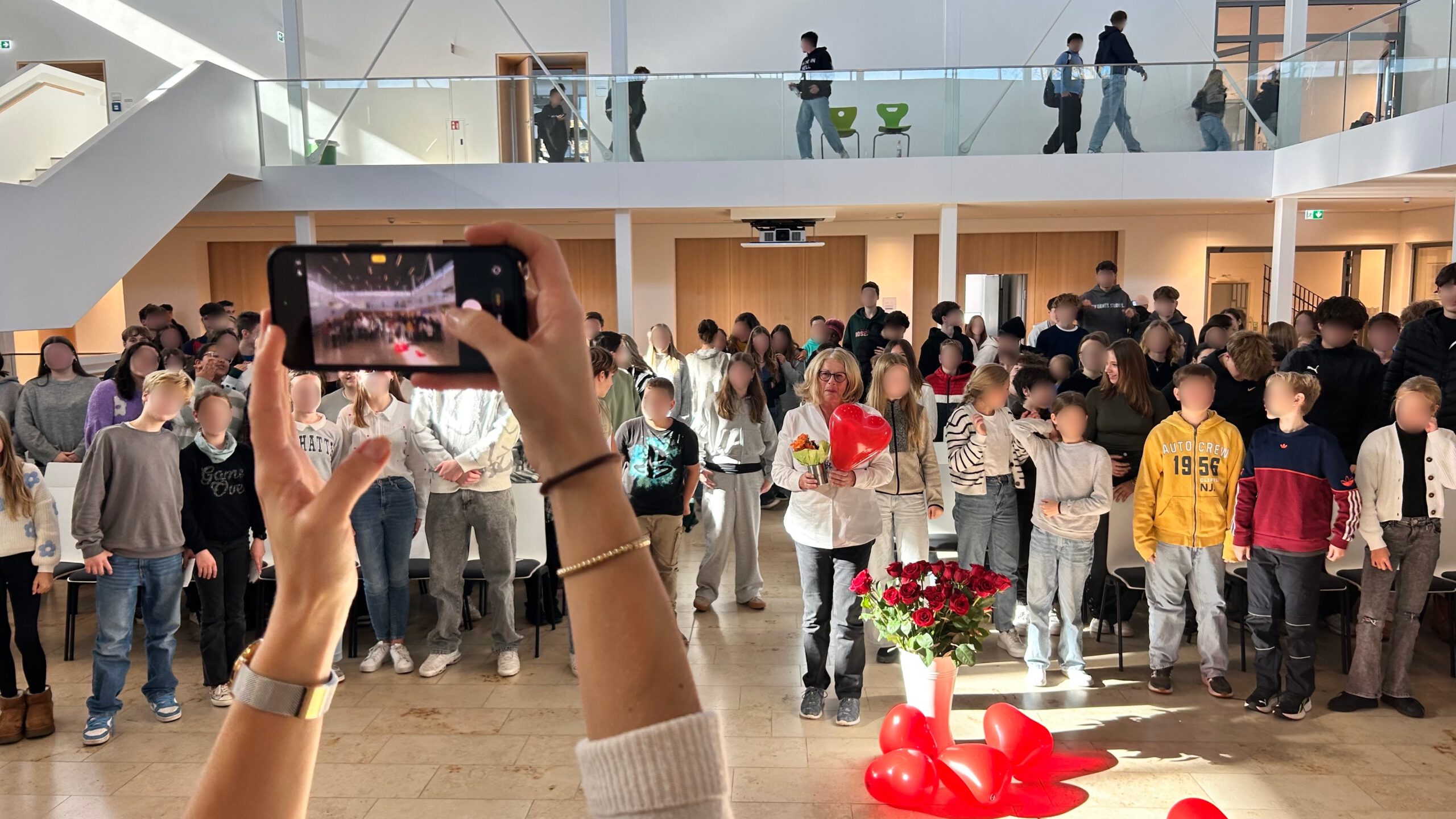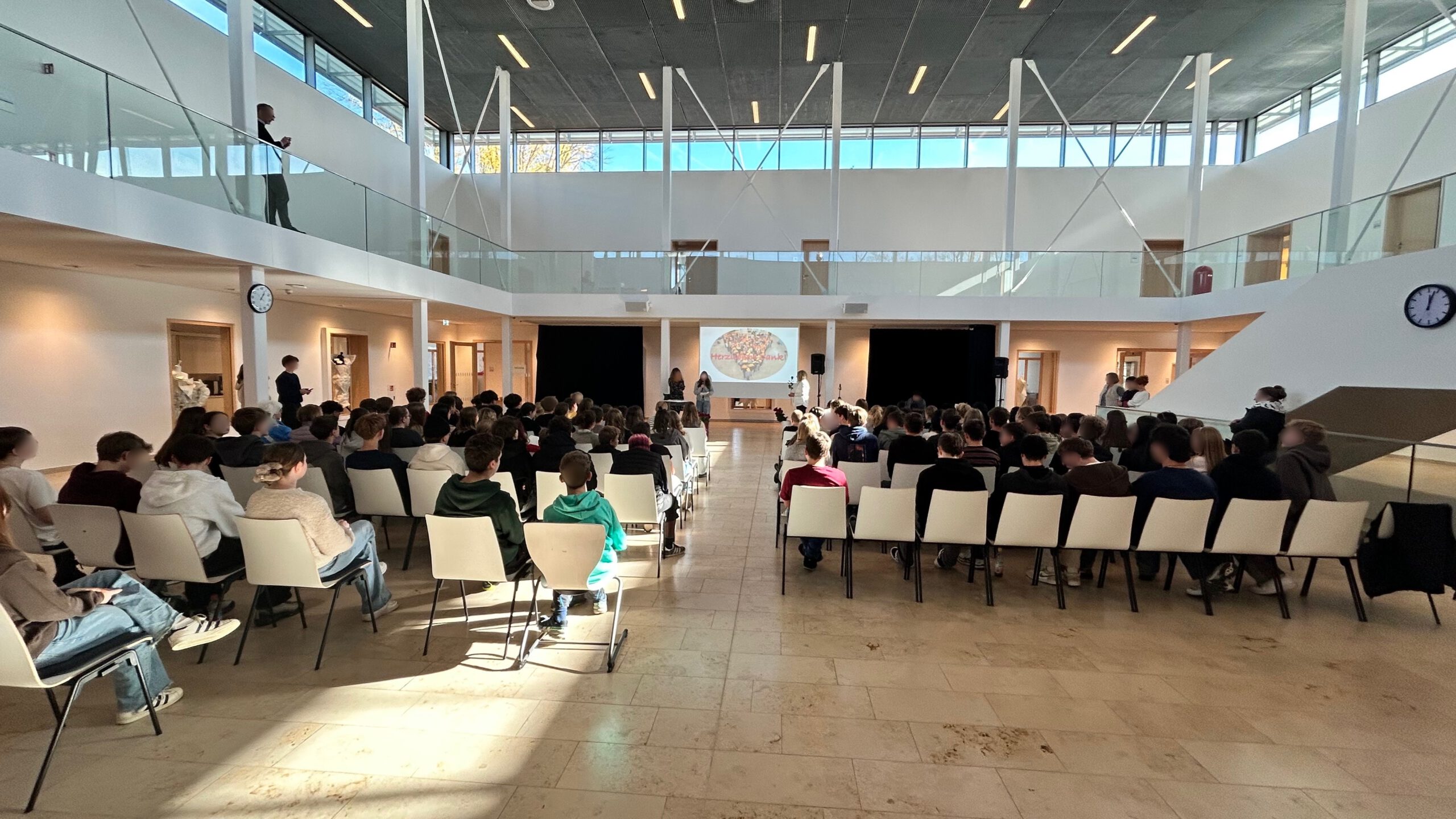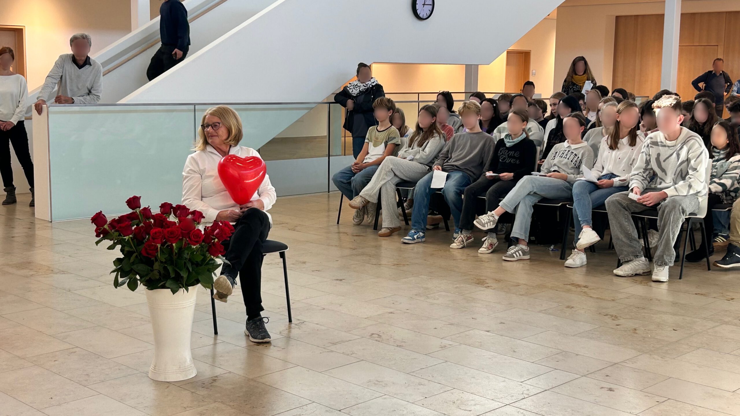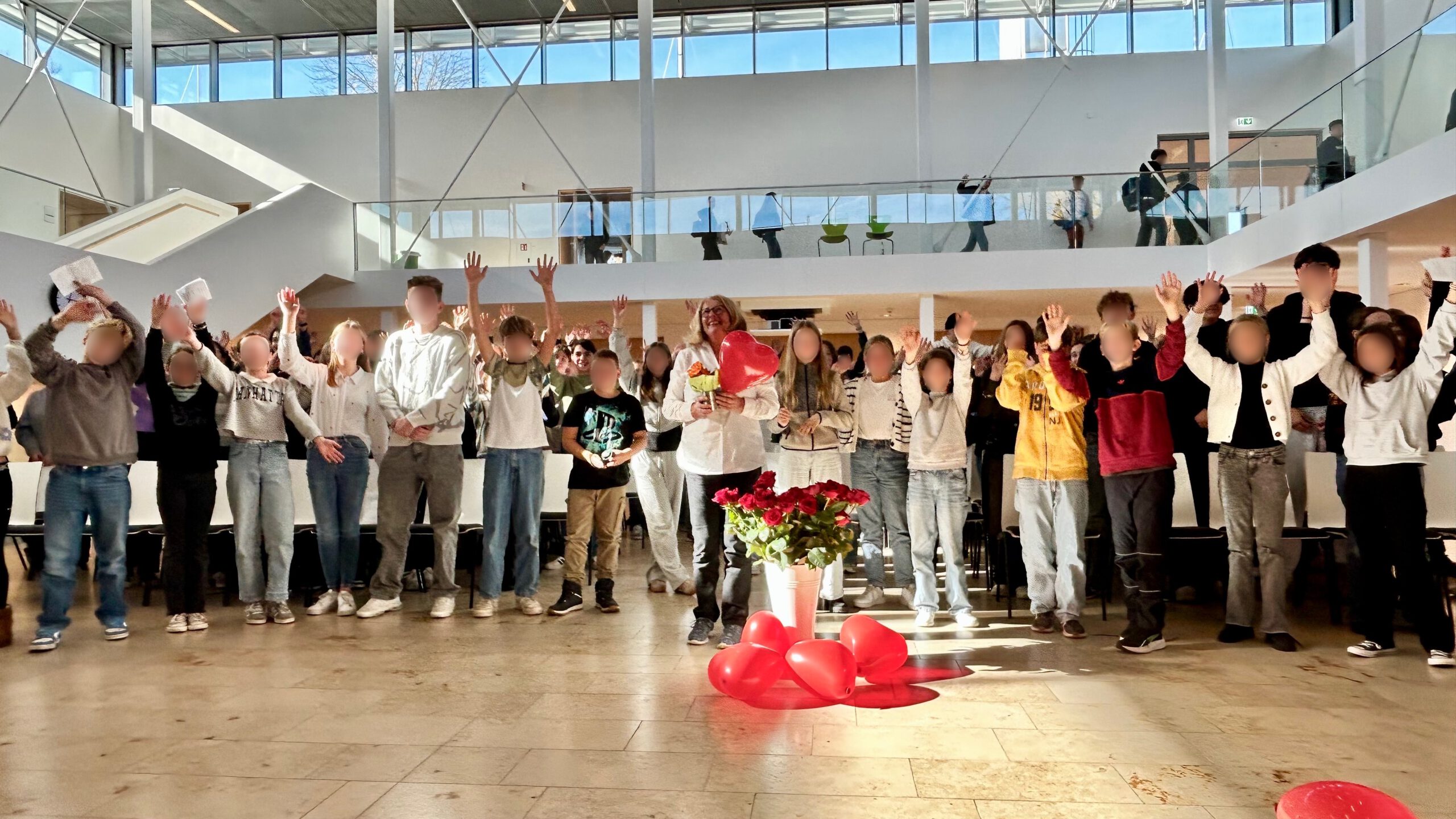 Im Rahmen einer stimmungsvollen Feier in der Aula würdigten Schulleiter Herr Wabner, die Elternbeiratsvorsitzende Frau Behnke, das gesamte Kollegium, die Schülersprecherinnen und Schülersprecher sowie alle Klassensprecherinnen und Klassensprecher das langjährige Wirken der beliebten Sekretärin. In sehr persönlichen Worten erinnerten die Schülervertreter an zahllose Momente des Schulalltags – von Pflastern, verlorenen Geldbeuteln und tröstenden Worten bis hin zu verlässlicher Hilfe in jeder kleinen und großen Notlage.