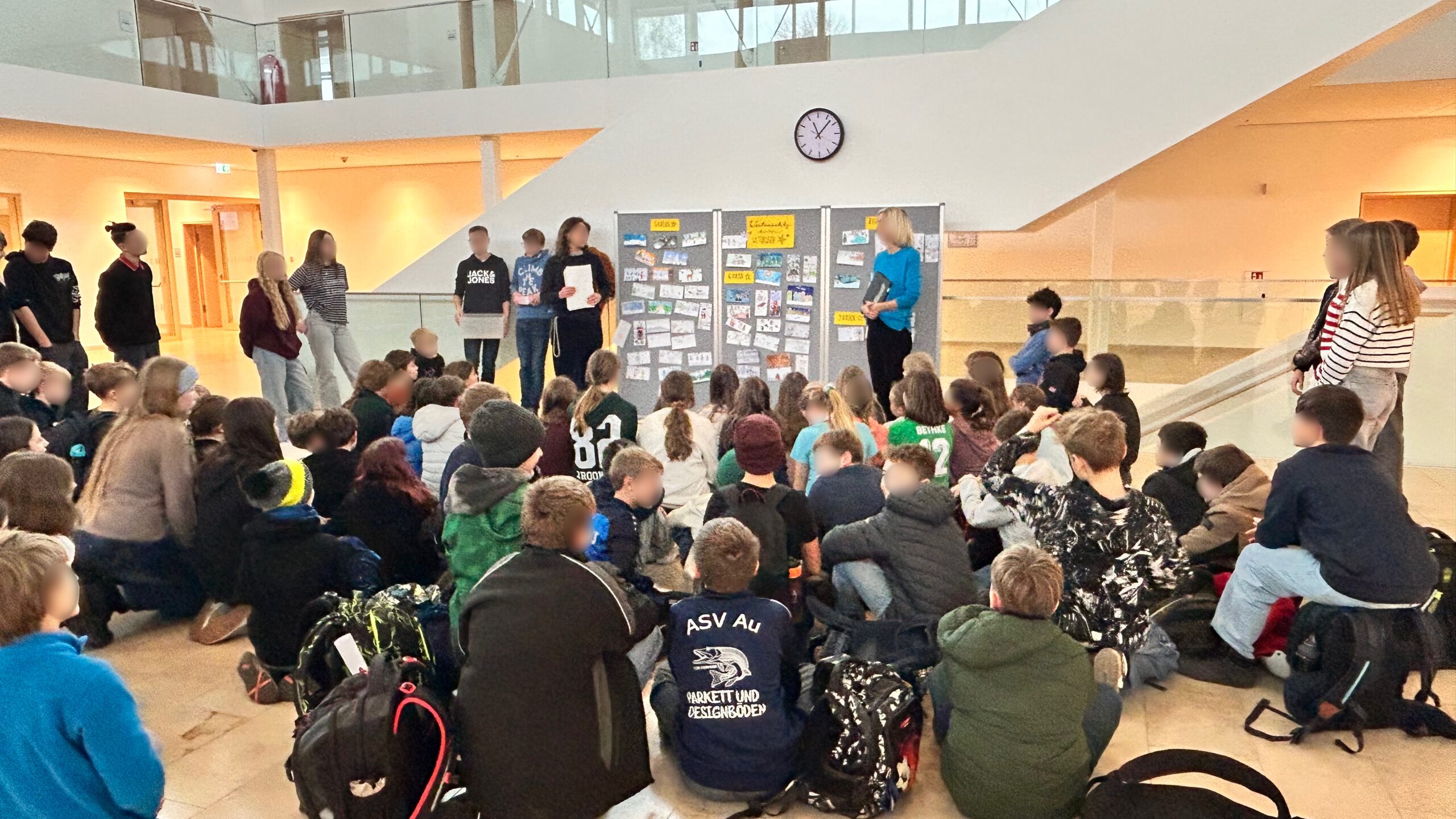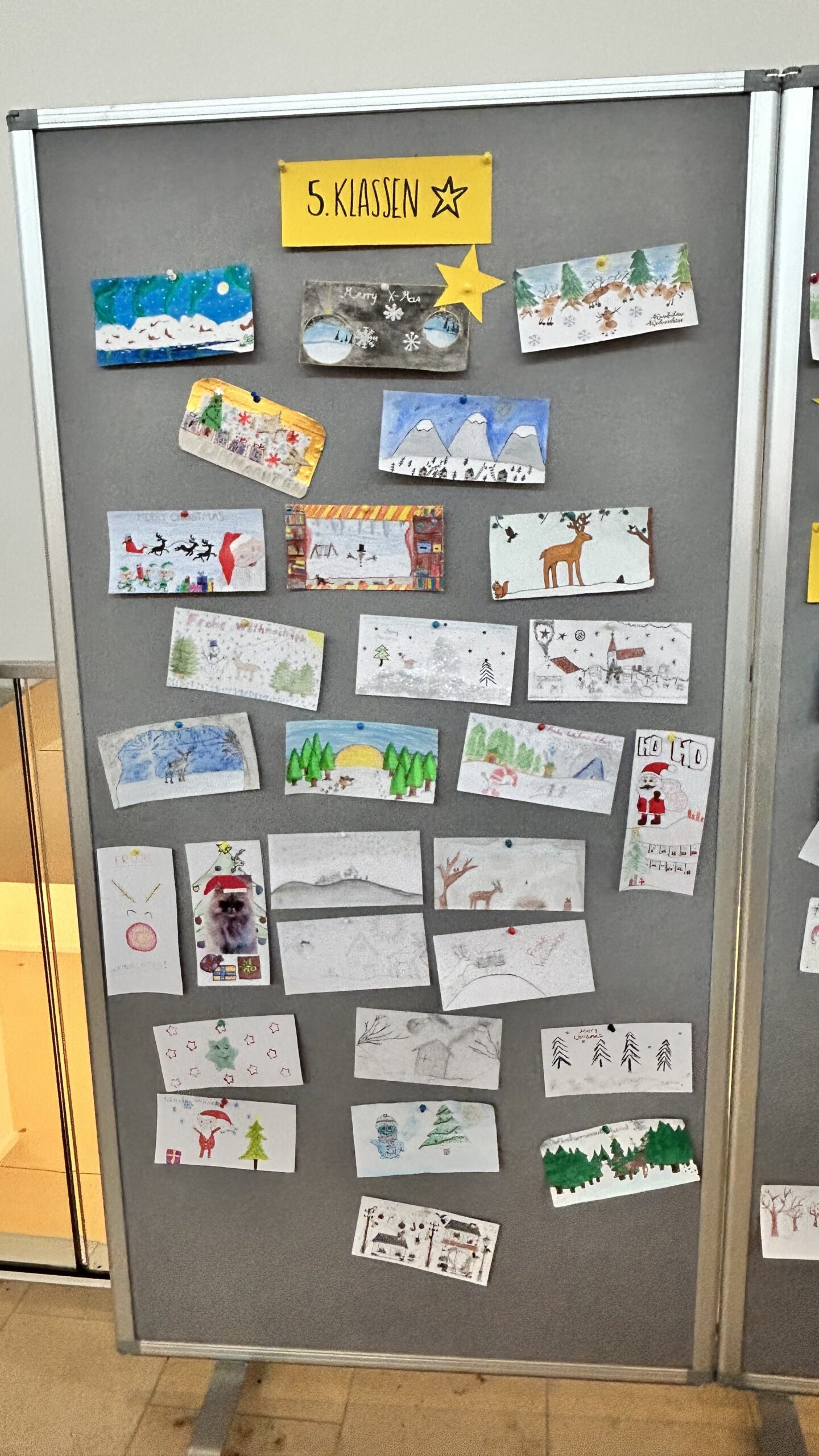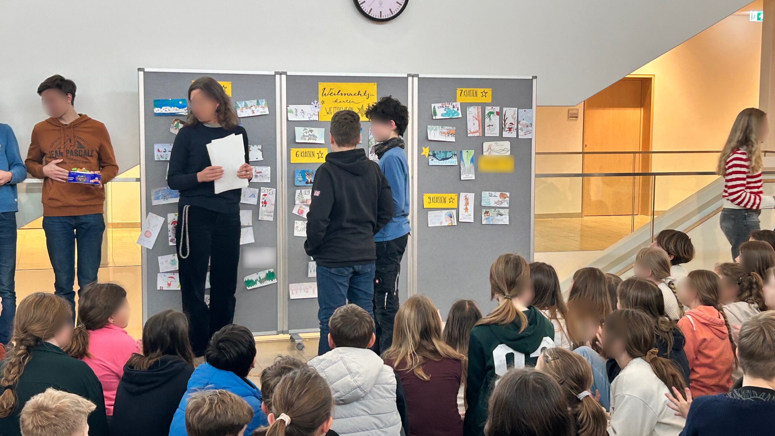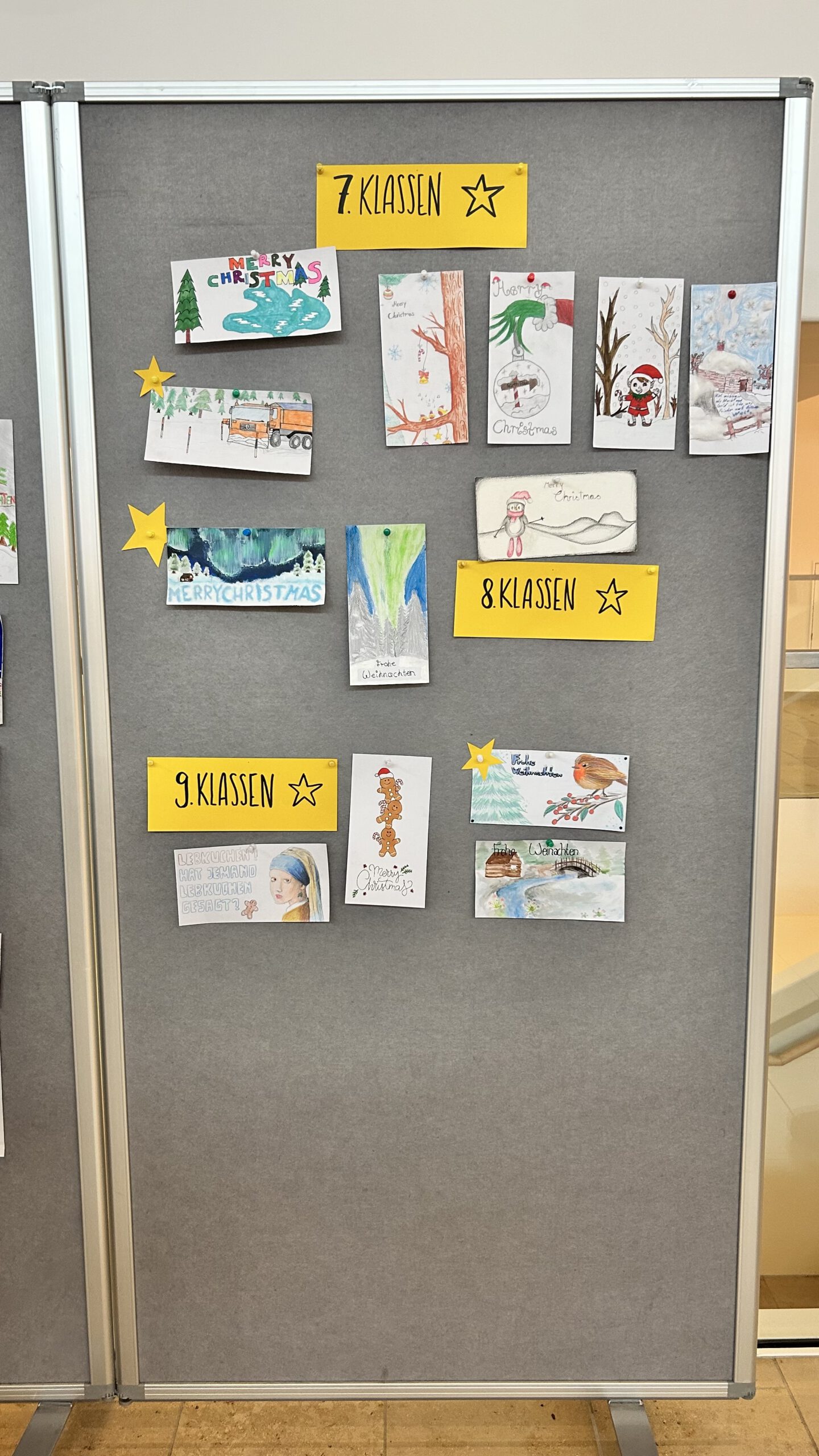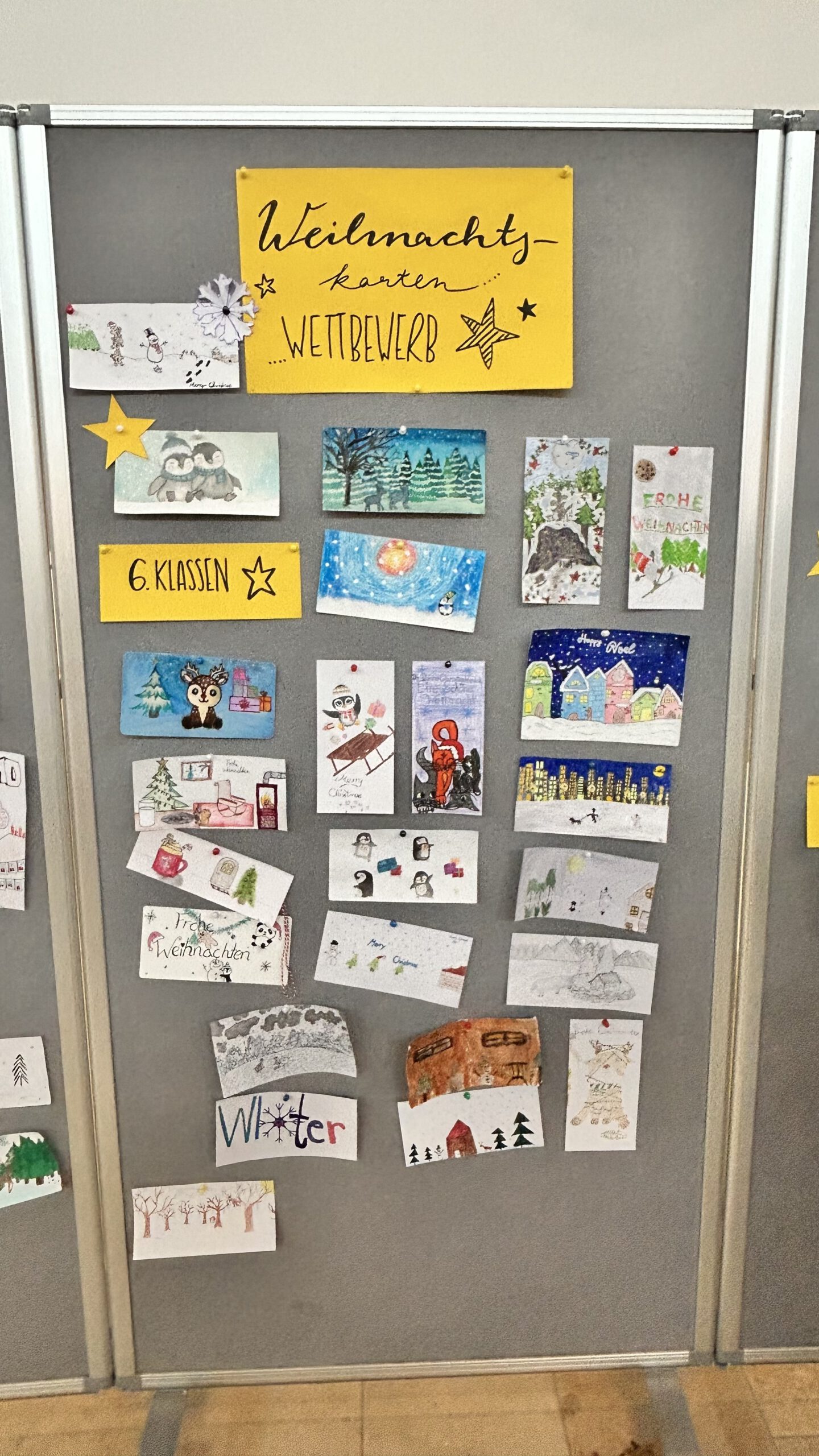 Unter dem Motto „Winterwunderland“ gestalteten die Schülerinnen und Schüler kreative Karten mit Schneelandschaften, Eiskristallen oder Tieren im Winter – alle Techniken waren erlaubt. Wir freuen uns sehr, dass sich insgesamt 56 Schülerinnen und Schüler am Wettbewerb beteiligt haben. Die Jury kürte drei Schulsieger: Johanna Steidl, 5e, Paula Kemetmüller, 6e, und Emily Kneißl, 8e. Außerdem wurden noch die Jahrgangsstufensieger aus den Klassen 7 (Simon Wöllmer) und 9 (Lynn Suderow) ausgezeichnet. Die Schulsiegerinnen konnten sich über Kinogutscheine freuen, und jeder Teilnehmer erhielt eine kleine süße Aufmerksamkeit als Dank für die Teilnahme.