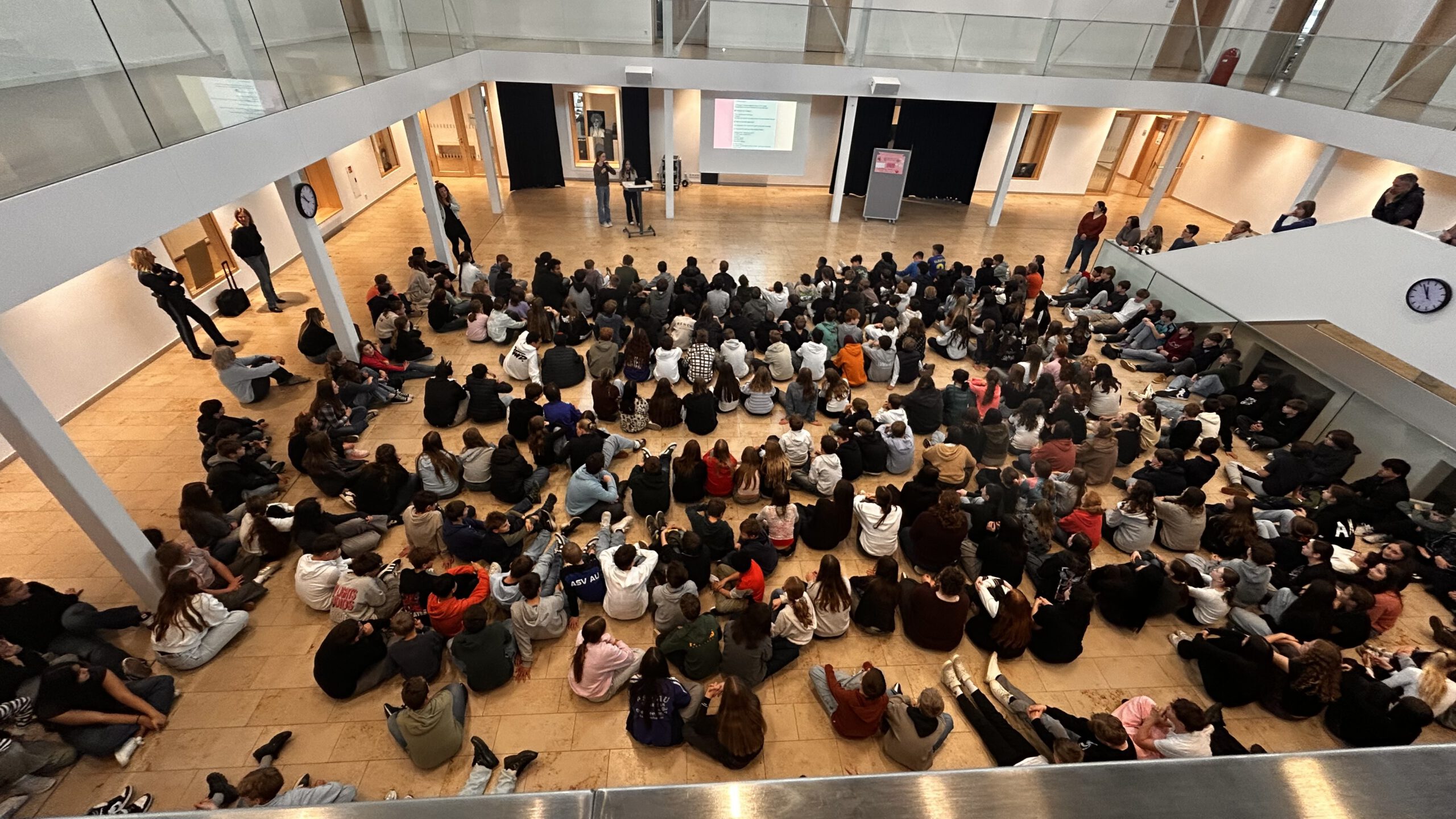 Der offizielle Startschuss fiel am Montag, den 13.04.2026 mit einer Schülervollversammlung in der Aula. Aufgrund der großen Schülerzahl wurde die Veranstaltung in zwei Gruppen mit jeweils rund 450 Schülerinnen und Schülern durchgeführt. Die beiden Wertebotschafterinnen Letizia und Sarah stellten ihr Konzept vor, erklärten die Bedeutung von Werten für die Schulgemeinschaft und gaben einen Ausblick auf die Aktionen der kommenden Tage.