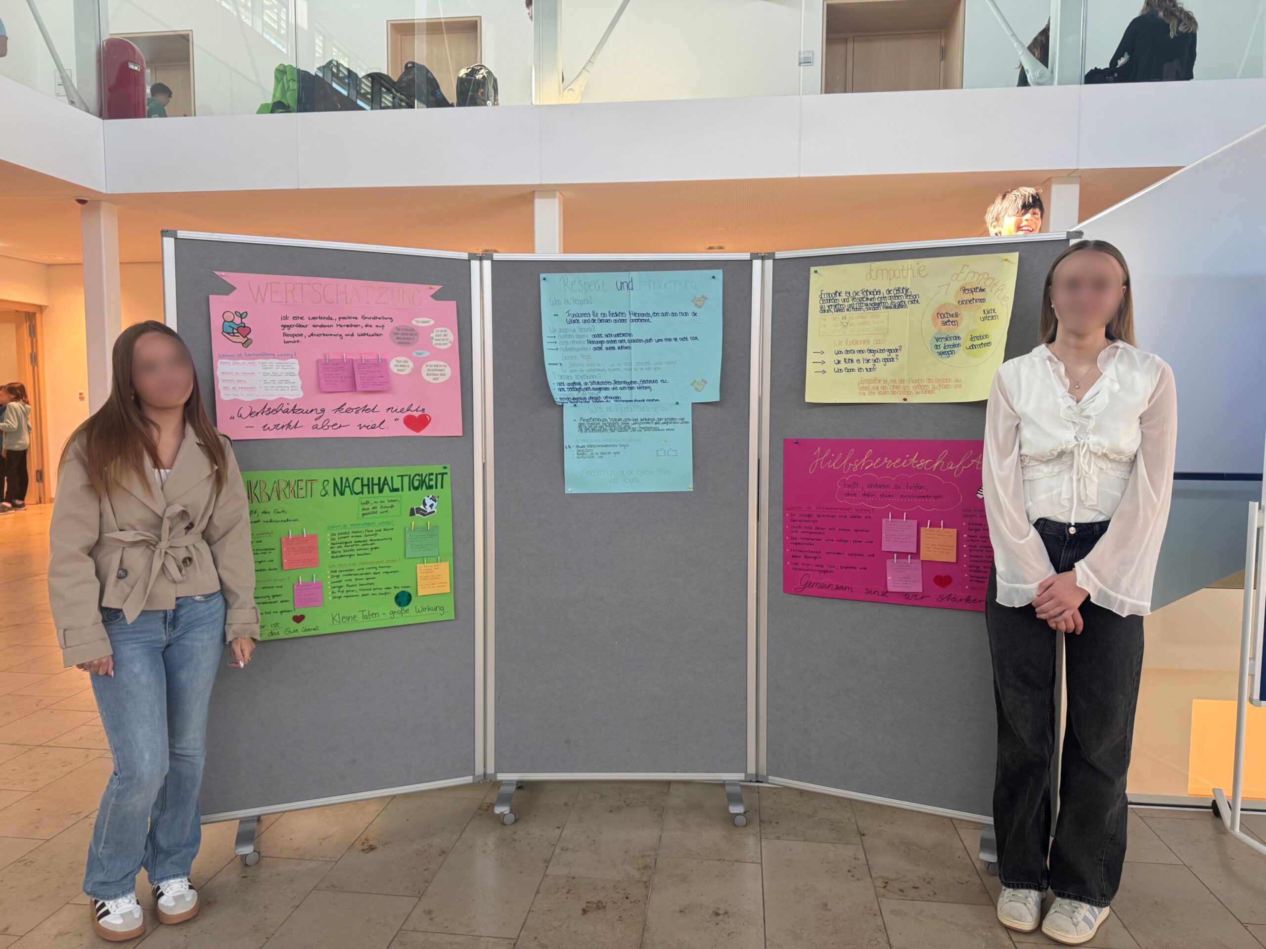 Während der gesamten Woche wurden die jeweiligen Tageswerte zusätzlich über Durchsagen und den Schulmanager kommuniziert. In der Aula ergänzten kreativ gestaltete Plakate der Wertebotschafterinnen das Programm. Sie enthielten Erklärungen, Impulse und Reflexionsfragen, die zum Nachdenken anregten.
